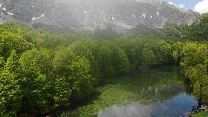 Με την ψηλότερη κορυφή του Λάκμου, την Τσουκαρέλα στα 2.295 μέτρα, πάνω από την αλπική λίμνη το τοπίο, είναι επιβλητικό.