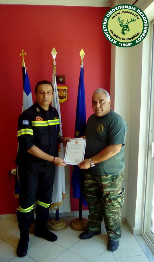 Ο Θηροφύλακας της Κυνηγετικής Ομοσπονδίας Πελοποννήσου Κωστής Σπύρος, με περιοχή ευθύνης του Κυνηγετικού Συλλόγου Ζακύνθου, παρέλαβε από τον Διοικητή της Πυροσβεστικής Υπηρεσίας Ζακύνθου Πύραρχο Ανδρέα Στεμπίλη τιμητικό δίπλωμα για ευδόκιμη εθελοντική υπηρεσία στο Πυροσβεστικό Σώμα.