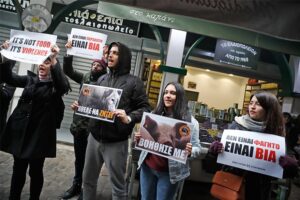 Η ομάδα ακτιβιστών που έδωσε το «παρών» στην αγορά της Θεσσαλονίκης κρατούσε πλακάτ που έγραφαν: «Δεν είναι φαγητό, είναι βία», τόσο στα ελληνικά, όσο και στα αγγλικά.