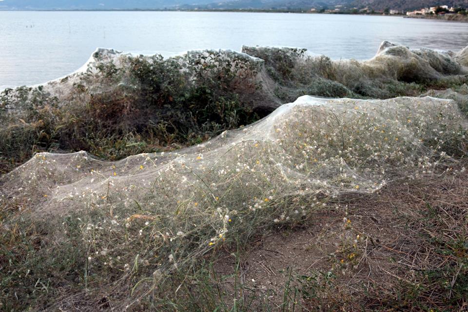 Ενα περίεργο και πρωτόγνωρο θέαμα αντίκρισα απόψε το βράδυ στο Αιτωλικό. Συγκεκριμένα στην ανατολική παραλία της λιμνοθάλασσας, πριν την γέφυρα, υπάρχει ένα τεράστιο πέπλο από αράχνες που έχει καλύψει τα φυτά (φοίνικες, αρμυρίκια και ποώδη βλάστηση) σε μήκος τουλάχιστο 300 μέτρων.