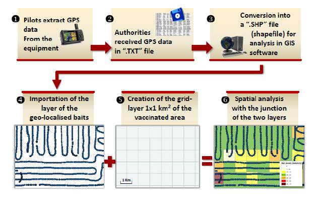 - Μόλις τελειώσουν οι ρίψεις γίνεται εξαγωγή των γεωγραφικών συντεταγμένων που έγιναν οι ρίψεις και αυτές αποτυπώνονται σε ένα χάρτη. Με αυτό τον τρόπο Το Τμήμα Ζωοανθρωπονόσων της Δ/νσης Υγείας των Ζώων της Γενικής Δ/νσης Κτηνιατρικής του ΥΠΑΑΤ θα γνωρίζει εαν έχουν ριφθεί σωστά τα δολώματα βάση του σχεδίου ρίψης.