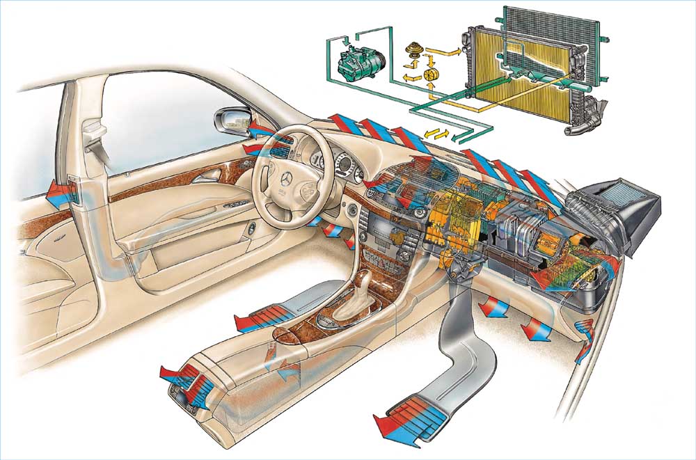 Αν και το σύστημα ψύξης του κινητήρα κα το σύστημα κλιματισμού αποτελούν δύο ξεχωριστά, η λειτουργία του ενός επιδρά στου άλλου. Ο βασικός λόγος είναι πως η λειτουργία του συστήματος κλιματισμού επιβαρύνει αυτή του ψύξης αυξάνοντας την θερμοκρασία του ψυκτικού υγρού. Εδώ να πούμε πως τα πρόσθετα που περιέχονται στο ψυκτικό δεν αποτρέπουν το πάγωμα του υγρού αλλά και από την υπερθέρμανσή του αυξάνοντας το σημείο ζέσεως πάνω από τους 120 C. Κάτι πολύ σημαντικό για χώρες με ζεστό κλίμα, όπως δηλ. της δικής μας.