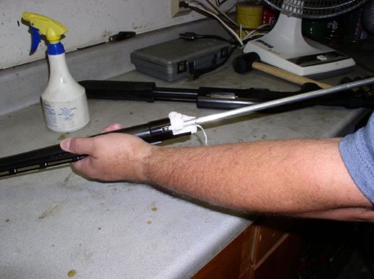 Επανερχόμαστε στην κάννη ή στις κάννες αν έχουμε δίκαννο, αφού πέρασε το δεκαπεντάλεπτο, που είναι το ελάχιστον για να μαλακώσουν τα κατάλοιπα. Βιδώνουμε στο άκρο της βέργας τη μεταλλική με λεπτές συρμάτινες ίνες από φωσφορούχο ορείχαλκο βούρτσα και περνάμε αρκετές φορές παλινδρομικά την κάννη –χωρίς να τη συστρέφουμε- από το πίσω μέρος πάντα (από τη θαλάμη) προς τα μπροστά (προς το στόμιο).