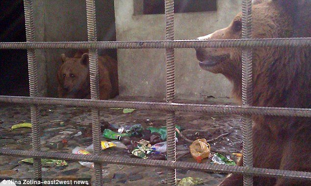 Οι δύο καφέ αρκούδες βρέθηκαν σχεδόν τυφλές, μετά βίας όρθιες, σε ελεεινή κατάσταση, στριμωγμένες μέσα σε ένα μικρό κλουβί, γεμάτο με ακαθαρσίες, άδεια μπουκάλια μπύρας και σκουπίδια.