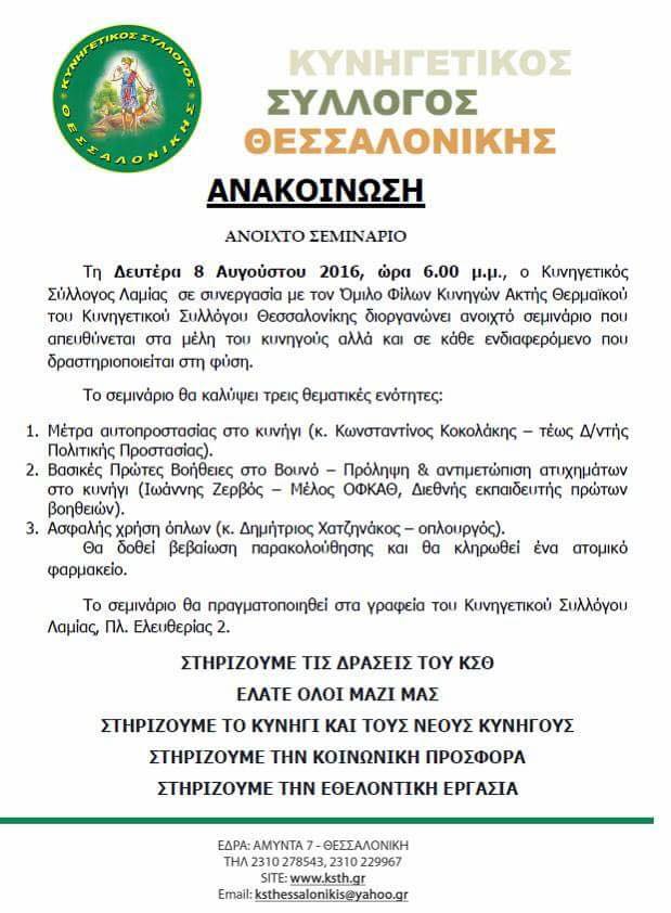 Τη Δευτέρα 8 Αυγούστου 2016 στις έξι το απόγευμα, ο Κ.Σ. Λαμίας σε συνεργασία με τον Όμιλο Φίλων Κυνηγών Ακτής Θερμαικού του ΚΣ Θεσσαλονίκης διοργανώνει ανοιχτό σεμινάριο που απευθύνεται στα μέλη του συλλόγου αλλά και σε όλους τους κυνηγούς και κάθε ενδιαφερόμενο που δραστηριοποιείται στη φύση. Δείτε την ανακοίνωση που ακολουθεί :