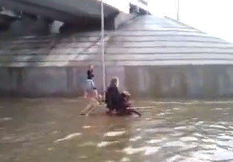 Συγκίνηση προκαλεί το βίντεο που ακολουθεί, όπου ένας σκύλος φαίνεται προσκολλημένος, εν μέσω πλημμύρας, στο αναπηρικό καροτσάκι του ιδιοκτήτη του. Η Huffington Post σημειώνει πως δεν είναι σαφές το πού συνέβη αυτό αλλά στο βίντεο ακούγεται μια γυναίκα να λέει στα ρώσικα «Καημένο σκυλί, φαίνεται να σπρώχνει το καρότσι».