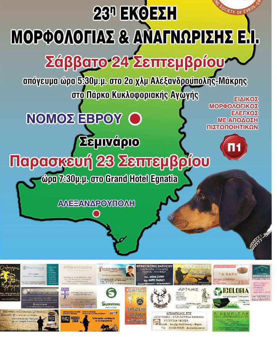 Ο Κυνοφιλικός Όμιλος Έβρου διοργανώνει σε συνεργασία με τον ΟΦΕΙ, έκθεση μορφολογίας και αναγνώρισης Ελληνικών Ιχνηλατών. Η εκδήλωση θα πραγματοποιηθεί το Σάββατο 24 Σεπτεμβρίου στις 5:30 το απόγευμα στο 2ο χλμ Αλεξανδρούπολης-Μάκρης στο Πάρκο Κυκλοφοριακής Αγωγής.