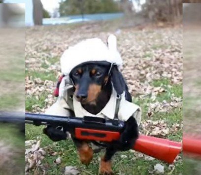 Όπως θα δείτε και εσείς, ο σκύλος φόρεσε τα κατάλληλα ρούχα για το κυνήγι, που δεν είναι άλλα από σκούφο και ένα μπουφάν παραλλαγής. Τέλος, στα χέρια του κρατά το τουφέκι του, που είναι φυσικά στα μέτρα του!