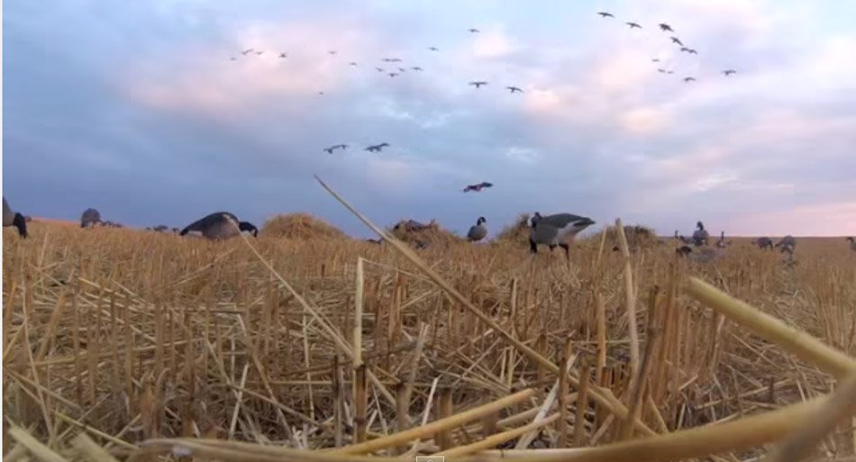 Ένα κλασσικό και άκρως εντυπωσιακό Αμερικάνικο κυνήγι χήνας με τα όλα του. Προηγείται η απαιτούμενη ανίχνευση εδάφους, για να βρεθούν τα σωστά χωράφια οπού τρέφονται τα πουλιά, έπειτα στήνονται με μαεστρία τα επιβαλλόμενα ομοιώματα (να ξαναυπενθυμίσουμε πως σαν Έλληνες έχουμε ίσως την παγκόσμια “πρωτοτυπία” να απαγορεύουμε τα ομοιώματα και τους φυσητούς κράχτες στο κυνήγι των υδροβίων…..) και τέλος μπαίνουν τα καρτέρια.