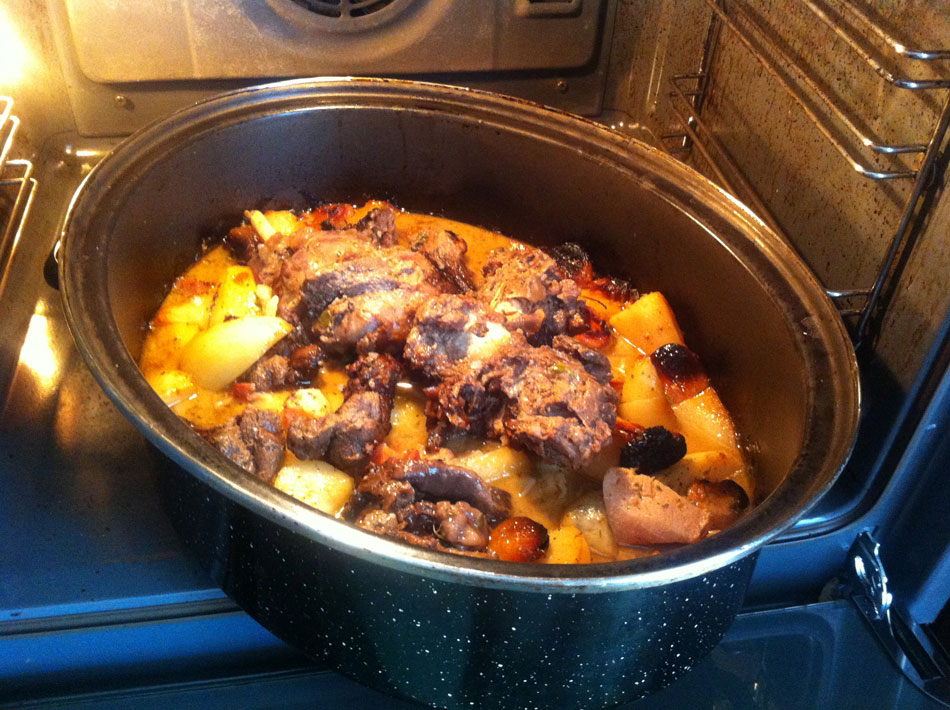 - 20 λεπτά πριν κλείσεις το φούρνο και ενώ σιγοβράζει στη γάστρα ο ζωμός, ρίξε μέσα καλά κομμένα κομμάτια από κυδώνια (2 μεγάλα κυδώνια) και μερικά ξερά δαμάσκηνα και βερίκοκα. Μην ρίξεις τα φρούτα από την αρχή γιατί θα λιώσουν και κατά δεύτερο θα γίνει πολύ γλυκερό το ζουμί.