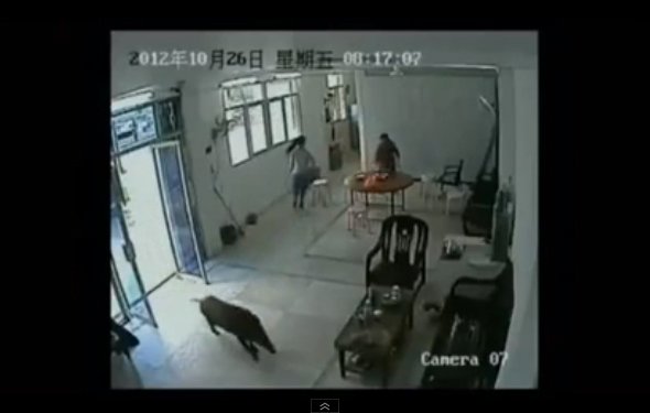 Ο αγριόχοιρος εισβάλει στο χώρο φανερά αναστατωμένος και η υπάλληλος προσπαθεί με μία πλαστική καρέκλα να τον διώξει! Ευτυχώς, έπειτα από μερικά λεπτά και μέσα στη σύγχυσή του καταφέρνει να βρει την έξοδο χωρίς να τραυματίσει κανέναν! Δείτε τι ακριβώς έγινε στο βίντεο που ακολουθεί: