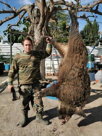 Ο αγριόχοιρος είχε βάρος 187kg. Ο Δημήτρης κυνηγούσε γουρούνια με την δεκαμελή παρέα του Κωστα Ζουμπόπουλου από Λαμία.