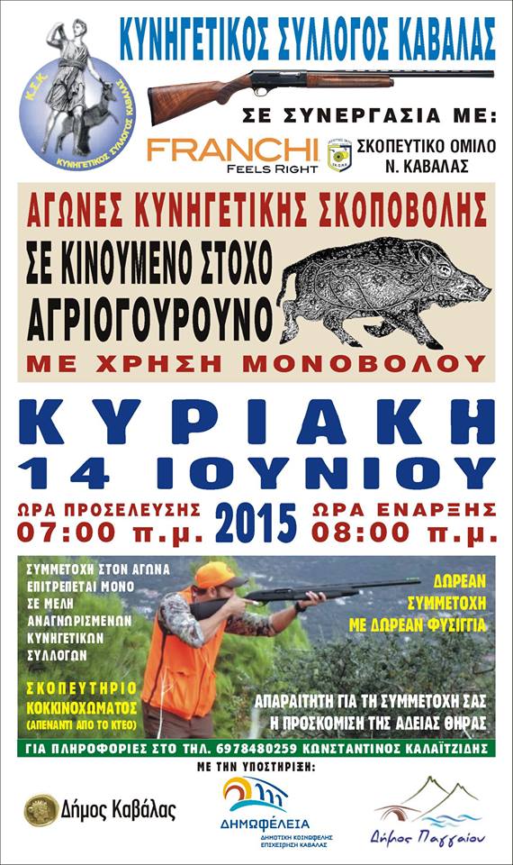 Ο Κυνηγετικός Σύλλογος Καβάλας σε συνεργασία με την εταιρεία Ναυπλιώτης Ιωάννης (Lambro, Franchi) και τον Σκοπευτικό Όμιλο Ν.Καβάλας, διοργανώνουν αγώνες κυνηγετικής σκοποβολής σε κινούμενο στόχο αγριόχοιρου με χρήση μονόβολου.