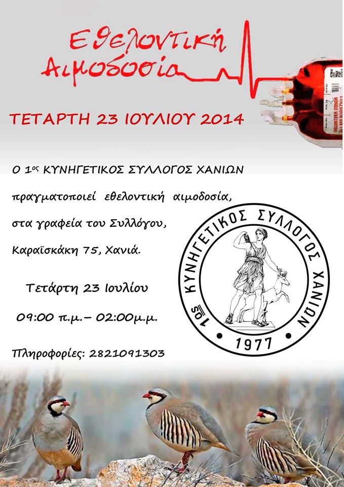 Ο ΚΥΝΗΓΕΤΙΚΟΣ ΣΥΛΛΟΓΟΣ ΧΑΝΙΩΝ πραγματοποιεί εθελοντική αιμοδοσία, στα γραφεία του Συλλόγου, την Τετάρτη 23 Ιουλίου 2014.