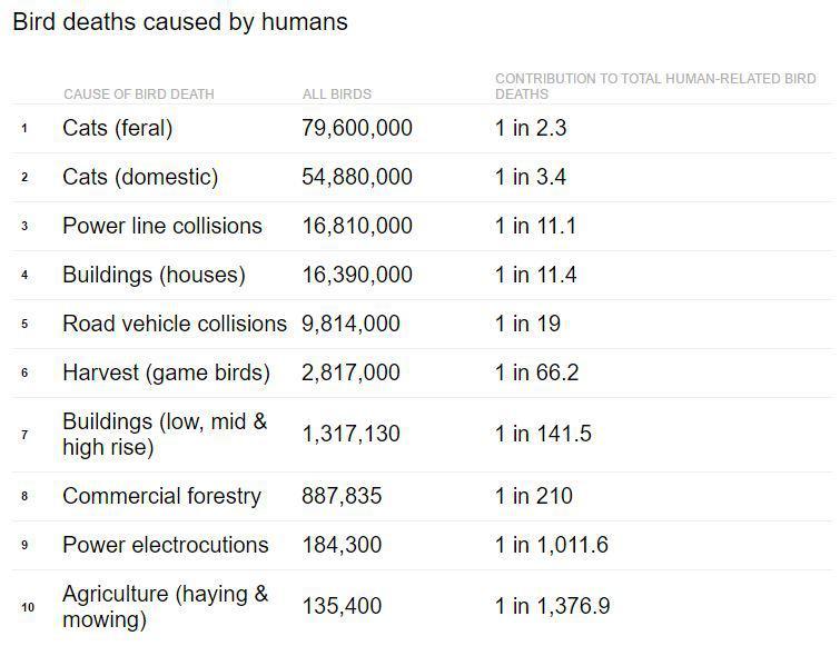 Ο παρακάτω πίνακας δείχνει τις κυριότερες αιτίες θανάτου από τα πουλιά σε ετήσιο σύνολο 186.429.553 εκτιμώμενων θανάτων που προκλήθηκαν από την ανθρώπινη δραστηριότητα (άμεση και έμμεση). Αν και βλέπουμε θανάτους από ηλεκτροφόρα καλώδια λόγω συγκρούσεων και ηλεκτροπληξίας, οι ανεμογεννήτριες δεν είναι στη λίστα.