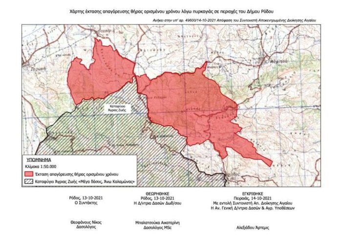 Απαγόρευση της θήρας όλων των θηραμάτων για τρία (3) χρόνια, ήτοι έως τη λήξη της κυνηγετικής περιόδου 2023-2024, σε έκταση(15.816) στρεμμάτων, που περιλαμβάνει την καείσα έκταση από την πυρκαγιά που εκδηλώθηκε στις 01 Αυγούστου 2021, καθώς και περιμετρική ζώνη μη καμένων εκτάσεων, στην περιοχή των Τοπικών Κοινοτήτων Θεολόγου, Μαριτσών και Ψίνθου του Δήμου Ρόδου.