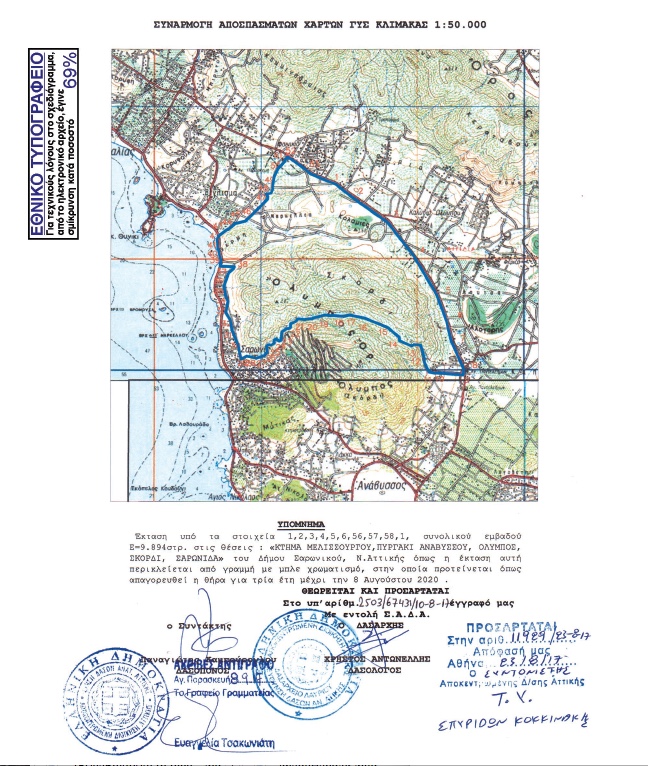 “….Aποφασίζουμε την απαγόρευση της θήρας όλων των θηραμάτων για τρία (3) έτη μέχρι και στις 8.8.2020 σε ολόκληρη την καμένη έκταση, μετά των περιφερειακών της μη καμένων τμημάτων, συνολικού εμβαδού «9.894 στρ.» εννέα χιλιάδων και οκτακοσίων ενενήντα τεσσάρων στρεμμάτων στις θέσεις «ΚΤΗΜΑ ΜΕΛΙΣΣΟΥΡΓΟΥ, ΠΥΡΓΑΚΙ ΑΝΑΒΥΣΣΟΥ, ΟΛΥΜΠΟΣ, ΣΚΟΡΔΙ, ΣΑΡΩΝΙΔΑ» του Δήμου Σαρωνικού, Ν. Αττικής, όπως η έκταση αυτή περικλείεται από την συνεχή με μπλε χρωματισμό γραμμή, υπό τα στοιχεία (1, 2, 3, 4, 5, 6, …, 57, 58. 1) και εμφαίνεται στο προσαρτημένο στην παρούσα απόφαση απόσπασμα χάρτη ΓΥΣ, κλίμακας 1:50.000 και η οποία οριοθετείται ως εξής: