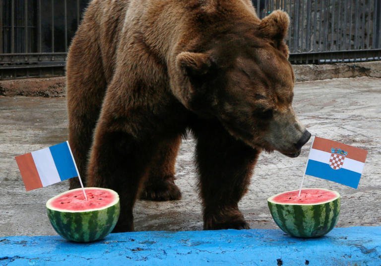 Έκοψαν στη μέση ένα καρπούζι, του έβαλαν τις σημαίες της Γαλλίας και της Κροατίας και τα τοποθέτησαν μπροστά στην αρκούδα