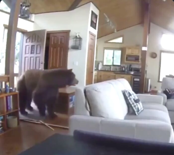 Το τουλάχιστον ανησυχητικό βίντεο ξεκινά με την αρκούδα να σπάει με εντυπωσιακή ευκολία την κλειστή πόρτα. Στη συνέχεια ο επιβλητικός θηρευτής αρχίζει να κόβει βόλτες μέσα στο σαλόνι του σπιτιού.