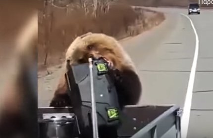 Μια αρκούδα πλησίασε το φορτηγάκι τους και άρπαξε το μικρό ψυγείο που είχαν στην καρότσα του οχήματος, ενώ εν συνεχεία έγινε καπνός.