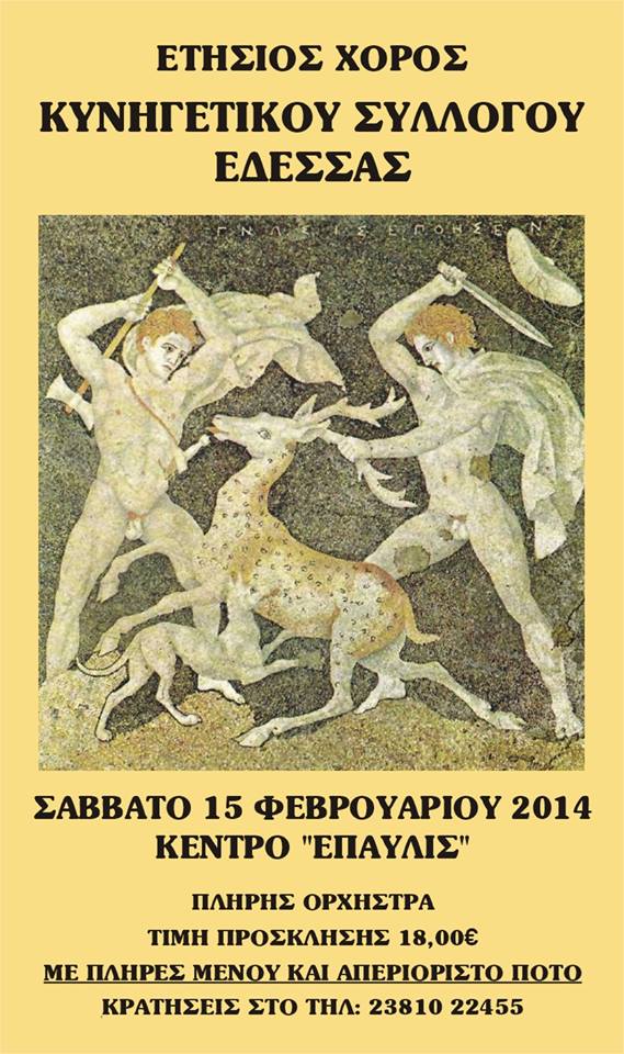 Ο κυνηγετικός σύλλογος Έδεσσας σας προσκαλεί να περάσετε μαζί μας ένα όμορφο βράδυ Σαββάτου στον ετήσιο χορό που θα γίνει 15/2/2014 και ώρα 9μμ στο κέντρο Έπαυλης, 4 χιλ Έδεσσας- Θεσσαλονίκης με υπέροχη ζωντανή μουσική φαγητό και απεριόριστο ποτό.