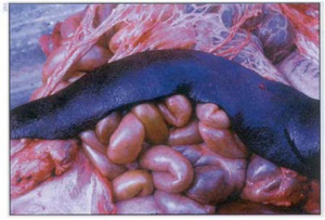 – σπλήνας διογκωμένος, σκουρόχρωμος με αιμορραγίες,