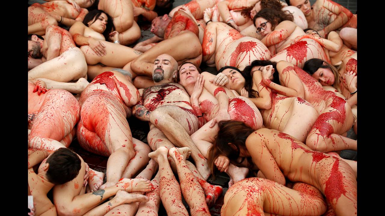 Δεκάδες άνθρωποι, γυμνοί και καλυμμένοι με ψεύτικο αίμα, ξάπλωσαν στην Πλατεία Καταλονίας της Βαρκελώνης, διαμαρτυρόμενοι για τη χρήση γούνας και δέρματος από την παγκόσμια βιομηχανία ένδυσης και μόδας.
