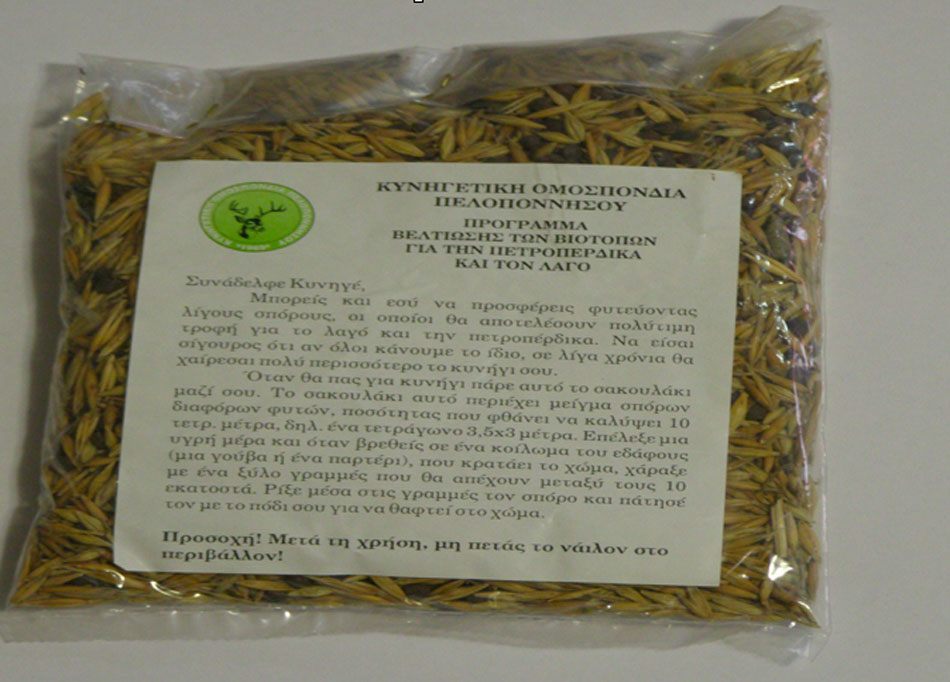 Έβδομη συνεχόμενη χρονιά η Κυνηγετική Ομοσπονδία Πελοποννήσου, μέσα από το πρόγραμμα που εκπονεί της βελτίωσης των βιοτόπων του λαγού και της πέρδικας, διένειμε και φέτος χιλιάδες σακουλάκια σπόρων σε κυνηγούς με την συνδρομή των Ομοσπονδιακών Θηροφυλάκων της.
