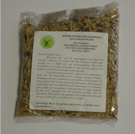 Έκτη συνεχόμενη χρονιά η Κυνηγετική Ομοσπονδία Πελοποννήσου, μέσα από το πρόγραμμα που εκπονεί της βελτίωσης των βιοτόπων του λαγού και της πέρδικας, διένειμε και φέτος χιλιάδες σακουλάκια σπόρων σε κυνηγούς με την συνδρομή των Ομοσπονδιακών Θηροφυλάκων της. Το μέτρο αυτό έχει τύχει ιδιαίτερης αποδοχής από τους κυνηγούς της Πελοποννήσου οι οποίοι έχουν ενστερνιστεί την προσπάθεια αυτή και όλο και περισσότεροι ζητάνε να προμηθευτούν τα σακουλάκια με τους σπόρους, έχοντας αντιληφθεί τα θετικά αποτελέσματα της προσφοράς τους στο θήραμα.