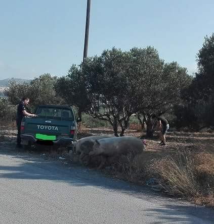 Τα γουρούνια όμως εξαγριώθηκαν και επιτέθηκαν στο περιπολικό της Αστυνομίας, προξενώντας του μικρής έκτασης φθορές.