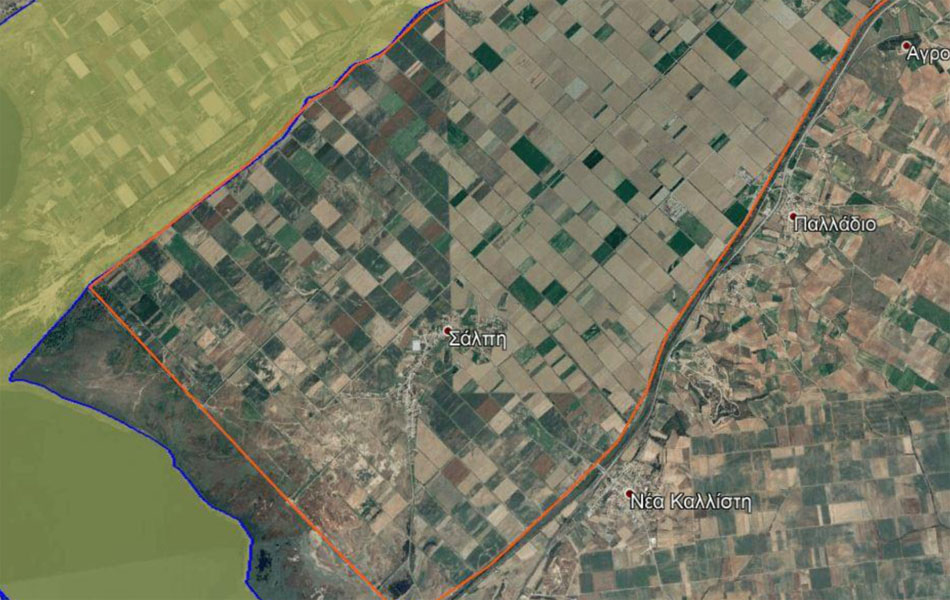 Νότιο όριο: Σημείο διασταύρωσης της εν λόγω οδού με την αγροτική οδό που διέρχεται κατά μήκος βορείως του βόρειου αναχώματος του ποταμού Τραύου.