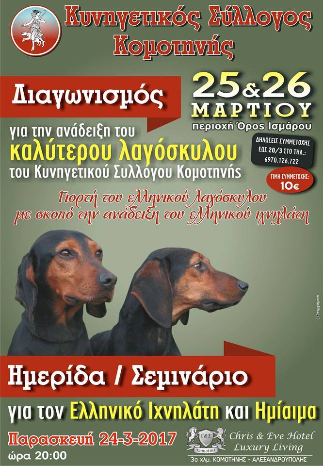 2. Διαγωνισμός για την ανάδειξη του καλύτερου λαγόσκυλου το Σαββατοκύριακο 25 & 26 Μαρτίου 2017 στην περιοχή του όρους Ισμάρου. Πληροφορίες- δηλώσεις συμμετοχής έως 20 Μαρτίου στα τηλέφωνα: 6970126722 και 2531022885. Τιμή συμμετοχής 10Ε.