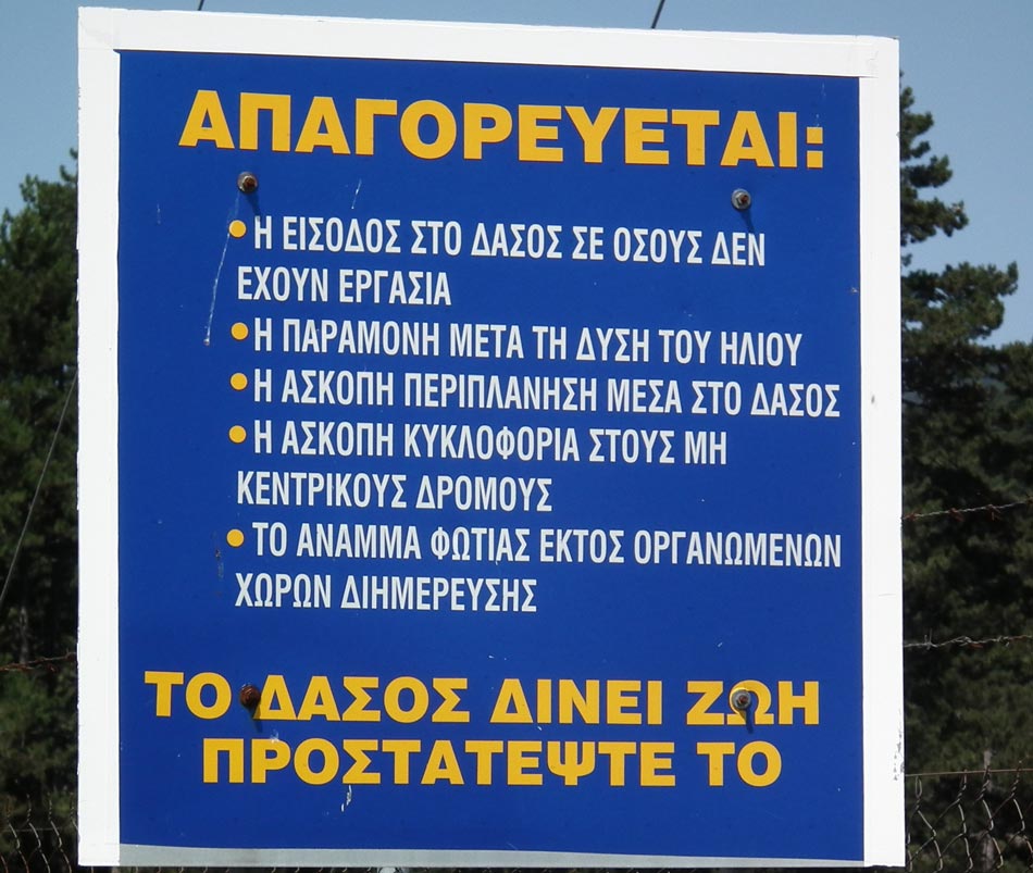 Ο δασοφύλακας δίπλα όμως (άνω των πενήντα και γύρω ένα πενήντα) βαρύς και απειλητικός: «αυτή είναι ταμπέλα της Πυροσβεστικής Υπηρεσίας για τις πυρκαγιές»…»