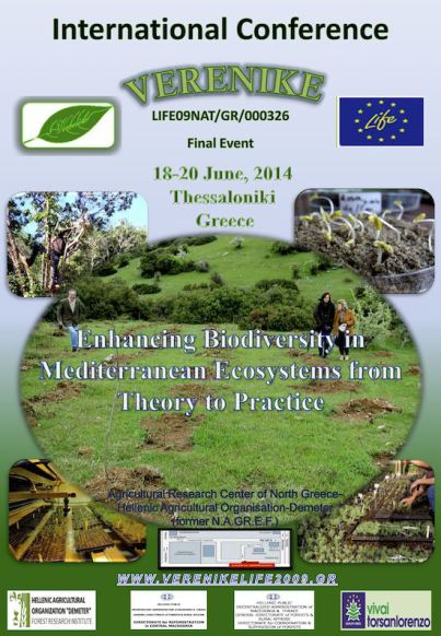 Το πρόγραμμα LIFE09NAT – VERENIKE ως τελική εκδήλωση οργανώνει Διεθνές Συνέδριο με θέμα “Enchanting Biodiversity in Mediterranean Ecosystems from Theory to Practice” στη Θέρμη Θεσσαλονίκης από 18 έως 20 Ιουνίου 2014.