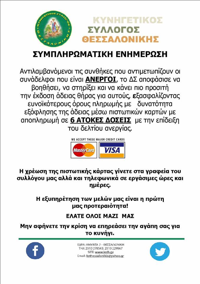 Αντιλαμβανόμενος τις δύσκολες οικονομικά συνθήκες που επικρατούν στη χώρα μας, ο ΚΣ Θεσσαλονίκης δίνει τη δυνατότητα στα μέλη του να εξοφλήσουν την άδεια θήρας σε τέσσερις άτοκες δόσεις με τη χρήση πιστωτικής κάρτας.