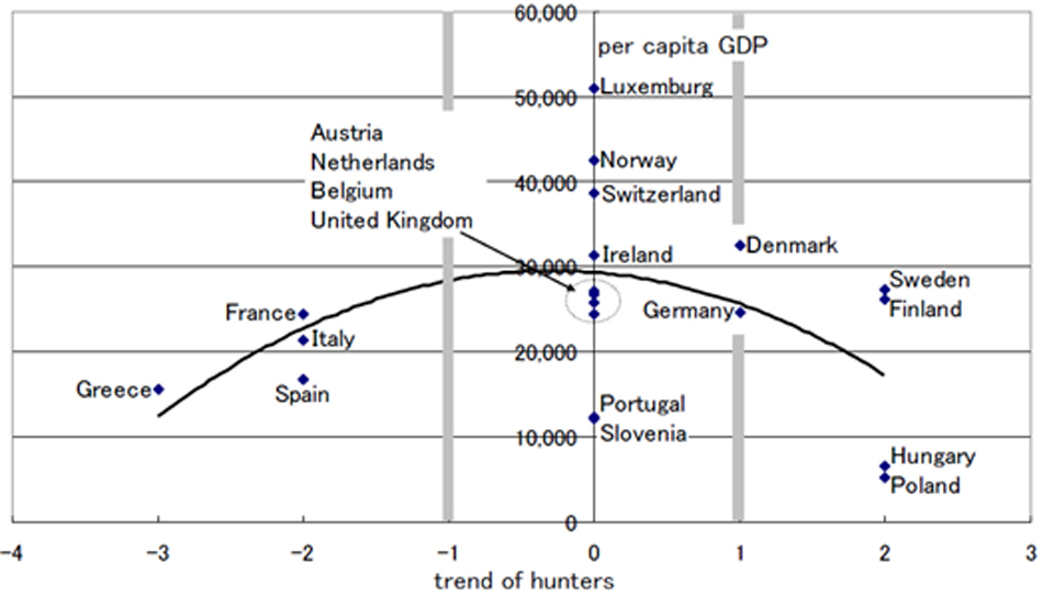 Πρόσφατη έρευνα έδειξε πως το ποσοστό των κυνηγών μεταξύ των χωρών της Ε.Ε. αυξάνεται όταν το κατά κεφαλήν ΑΕΠ είναι μεταξύ 5.000 και 15.000 δολάρια. Όταν το κατά κεφαλήν ΑΕΠ ξεπεράσει τα 15.000 δολάρια, εντοπίστηκαν δύο τάσεις: ο αριθμός των κυνηγών συνεχίζει να αυξάνεται σε ορισμένες χώρες, αλλά μειώνεται σε ορισμένες άλλες.
