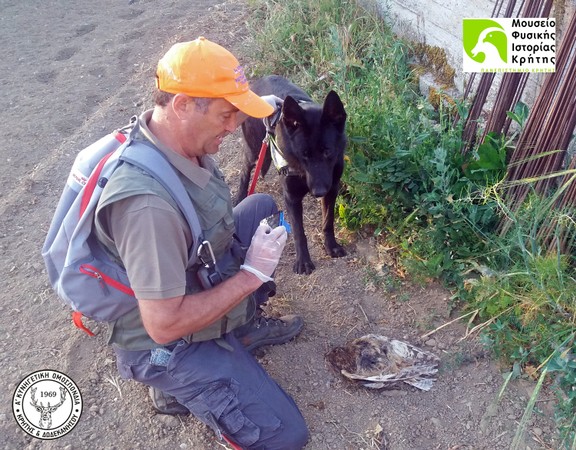Σε αυτοψία που πραγματοποίησαν την προηγούμενη Παρασκευή τα δύο εκπαιδευμένα σκυλιά, Ντάικα και Καρίνα, μαζί με τους χειριστές-Ομοσπονδιακούς Θηροφύλακες της Α’ Κυνηγετικής Ομοσπονδίας Κρήτης και Δωδεκανήσου, με την επίβλεψη του εκπαιδευτή των σκυλιών κ. Jesus Lopez στο Κουρτέσι Πινακιανού, Οροπεδίου Λασιθίου, εντόπισαν αρχικά ένα νεκρό αρπακτικό νυκτόβιο πουλί, 2 θηλιές και 2 δόκανα σε καλλιεργημένη έκταση.