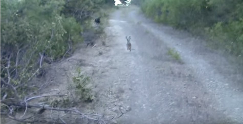 Άκρως εντυπωσιακό στιγμιότυπο κατά την εξέλιξη φετινού λαγοκυνηγιού, κατά το οποίο ο λαγός κυνηγημένος τόσο κοντά από τον σκύλο βγαίνει πάνω στον χωματόδρομο και τραβάει γραμμή προς τον ακίνητο συνάδελφο προφανώς χωρίς να τον έχει αντιληφθεί εκτός την τελευταία στιγμή που πλέον δεν είχε περιθώρια ελιγμών και δεν μπορεί να κάνει τίποτα άλλο από το να περάσει κυριολεκτικά από δίπλα του.
