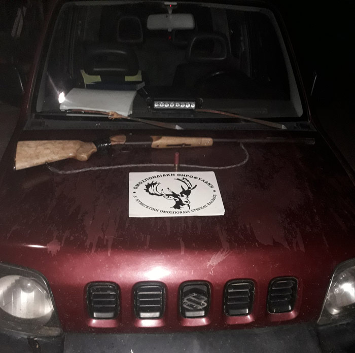 Κατασχέθηκαν μια κυνηγετική καραμπίνα, φυσίγγια και ένας προβολέας. Η υπόθεση πήρε το δρόμο της δικαιοσύνης.
