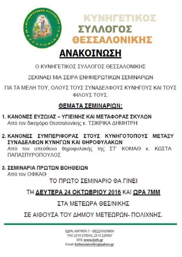 Ο Κυνηγετικός σύλλογος Θεσσαλονίκης ξεκινάει μια σειρά ενημερωτικών σεμιναρίων για τα μέλη του. Τα θέματα των σεμιναρίων είναι :