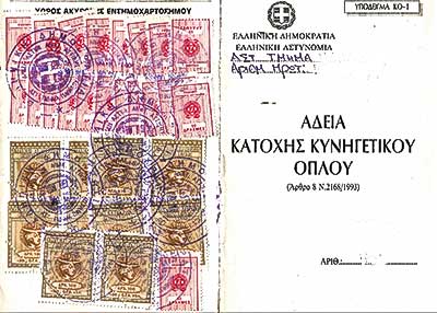 34. Άδεια κατοχής όπλων και λοιπών αντικειμένων του Ν. 2168/1993 (Φ.Ε.Κ. 147/Α΄/1993) χαρακτηριζόμενων ως συλλεκτικών, ιστορικών και οικογενειακών κειμηλίων (νομικό ή φυσικό πρόσωπο)