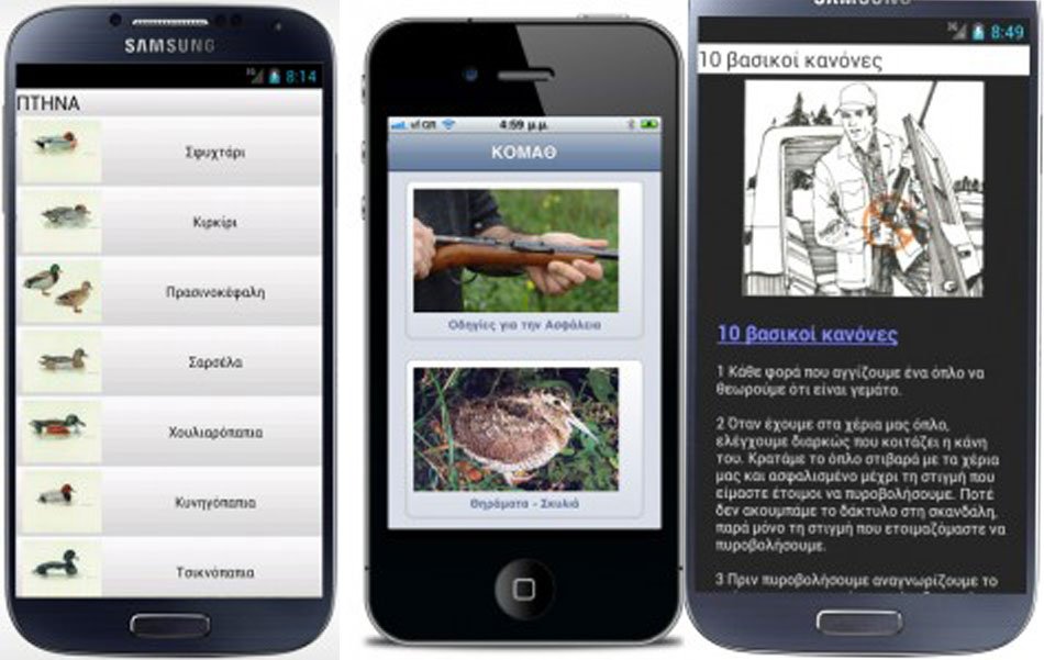 Κατεβάστε εντελώς δωρεάν και εγκαταστήστε στο κινητό σας τηλέφωνο την παρουσίαση των θηραμάτων, πτηνών και θηλαστικών, τους κυνηγετικούς σκύλους με φωτογραφίες καθώς και αναλυτική περιγραφή για το κάθε ένα. Επίσης, θα βρείτε χάρτες με τα καταφύγια άγρας ζωής της Μακεδονίας – Θράκης, όπως αυτά υπάρχουν στην ιστοσελίδα του YΠΑΠΕΝ. Ακόμη μπορείτε να διαβάσετε οδηγίες για την ασφάλεια στο κυνήγι, οδηγίες για την εξέταση υγείας του θηράματος, ενώ οι κυνηγετικοί σύλλογοι, οι κυνηγετικές ομοσπονδίες, καθώς και το έργο της ΚΟΜΑΘ είναι άλλες ενότητες που παρουσιάζονται.