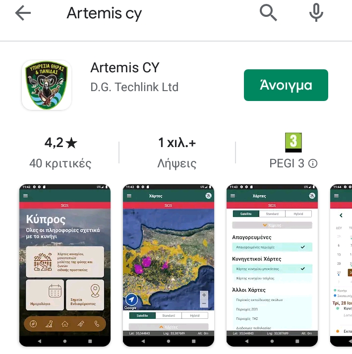 Η Υπηρεσία Θήρας και Πανίδας, από το περασμένο καλοκαίρι, έχει δημιουργήσει την εφαρμογή «Artemis Cy», για έξυπνα κινητά τηλέφωνα, η οποία δημιουργήθηκε με σκοπό την υποβοήθηση κυρίως των κυνηγών αλλά και των άλλων πολιτών ή τουριστών που ασχολούνται με δραστηριότητες στην ύπαιθρο.