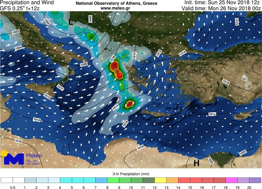 Από αργά το βράδυ της Κυριακής 25/11/2018 και κυρίως τις νυκτερινές ώρες προς τη Δευτέρα 26/11/2018, η “Πηνελόπη” θα επηρεάσει το Ιόνιο και τα δυτικά ηπειρωτικά με ισχυρές βροχές και καταιγίδες που κατά τόπους είναι πιθανό να συνοδεύονται από χαλαζοπτώσεις. Τα φαινόμενα κατά τη διάρκεια της νύχτας θα επεκταθούν ανατολικότερα, επηρεάζοντας μέχρι το ξημέρωμα τις περισσότερες της χώρας, και ενδεχομένως το νομό Αττικής. Από τις μεσημεριανές ώρες και μετά οι βροχές και οι καταιγίδες σταδιακά θα περιοριστούν κυρίως στη Δυτική Ελλάδα, στα νησιά του Ανατολικού Αιγαίου, στα Δωδεκάνησα και στη Δυτική Κρήτη, διατηρώντας κατά τόπους σχετικά έντονο χαρακτήρα. Οι θερμοκρασίες θα σημειώσουν μικρή άνοδο, ενώ στα πελάγη θα επικρατήσουν άνεμοι νοτίων διευθύνσεων με εντάσεις έως 7 μποφόρ και τοπικά στο Αιγαίο έως 8 μποφόρ. Στο χάρτη και στην εικόνα που ακολουθούν παρουσιάζονται η κατανομή των βροχοπτώσεων που θα εκδηλώνονται τις πρώτες ώρες μετά τα μεσάνυχτα της Κυριακής και οι περιοχές όπου θα εκδηλώνονται έντονα φαινόμενα τις πρωινές ώρες της Δευτέρας.