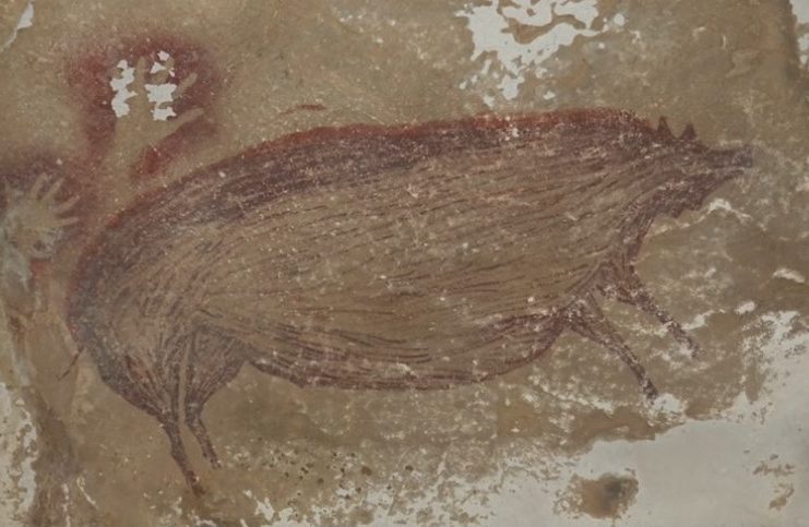 Στη απεικόνιση διακρίνεται ένα αγριογούρουνο και δύο παλάμες πάνω από το τρίχωμά του. Η συγκεκριμένη σπηλαιογραφία θεωρείται ως η αρχαιότερη στον κόσμο. Ανακαλύφθηκε στη νήσο Σουλαουέζι της Ινδονησίας το 2017, δημοσιεύτηκε τον Ιανουάριο του 2021 και χρονολογείται πριν από τουλάχιστον 45.500 χρόνια. Θεωρείται η αρχαιότερη αναπαραστατική ζωγραφιά σπηλαίου που έχει βρεθεί μέχρι σήμερα.