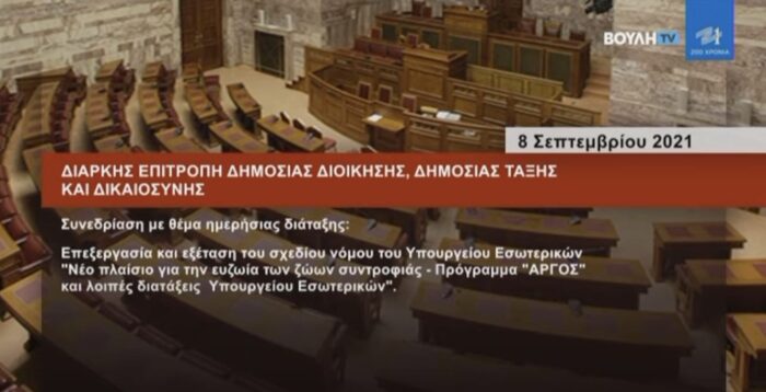 Συνεδρίασε εχθές το απόγευμα η Διαρκής Επιτροπή Δημόσιας Διοίκησης, Δημόσιας Τάξης και Δικαιοσύνης με θέμα την Επεξεργασία και εξέταση τoυ σχεδίου νόμου του Υπουργείου Εσωτερικών «Νέο πλαίσιο για την ευζωία των ζώων συντροφιάς – Πρόγραμμα ‘‘ΆΡΓΟΣ’’.