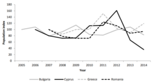 Σχήμα 3. Πληθυσμιακός δείκτης για το τρυγόνι σε Βουλγαρία, Κύπρο, Ελλάδα και Ρουμανία.
