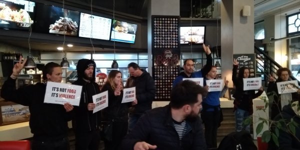 Ομάδα ακτιβιστών κρατώντας πλακάτ στα χέρια τα οποία έγραφαν «δεν είναι φαγήτο, είναι βία» μπήκαν το απόγευμα της Πέμπτης (18/4) σε δημοφιλές εστιατόριο στο κέντρο της Θεσσαλονίκης φωνάζοντας συνθήματα υπέρ της υπεράσπισης των δικαιωμάτων των ζώων και της ανθρώπινης διατροφικής αλυσίδας στη ζωή.