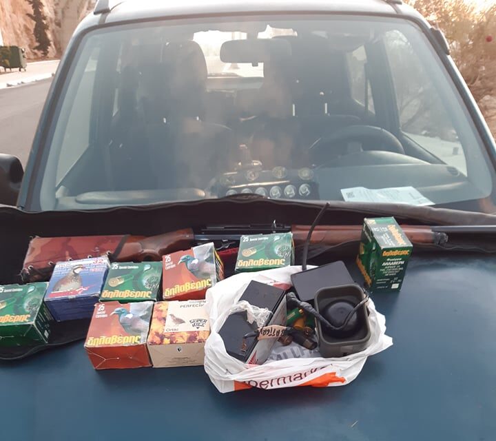 Μέσα στο αυτοκίνητο βρέθηκαν και κατασχέθηκαν περισσότερα από 200 φυσίγγια για κυνήγι ορτυκιού. Επίσης κατασχέθηκαν τα όπλα και η ηχομιμητική συσκευή.