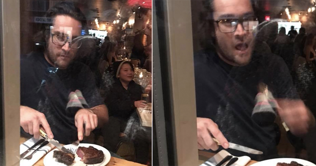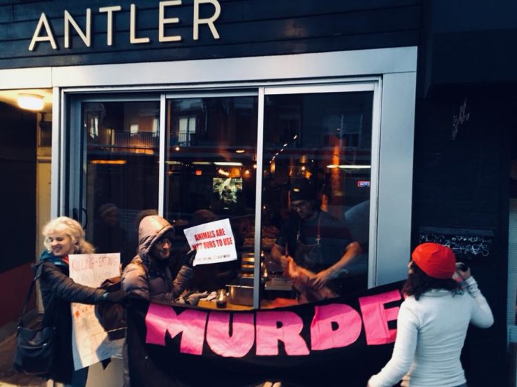Ένας ιδιοκτήτης εστιατορίου άρχισε να τρώει μια μπριζόλα μπροστά από μια ομάδα βίγκαν διαδηλωτών που διαμαρτύρονταν έξω από το εστιατόριό του στο Τορόντο του Καναδά. Ο Μάικλ Χάντερ έριξε νερό σε αυτά που είχαν γράψει οι διαδηλωτές με κιμωλίες στο πεζοδρόμιο και μετά άρχισε να τρώει ένα κομμάτι ελάφι μπροστά τους. Το αίτημα των διαδηλωτών που είχαν γράψει με κιμωλία στο πεζοδρόμιο ήταν να προσθέσει ο Χάντερ μπριζόλα για χορτοφάγους στο μενού του.